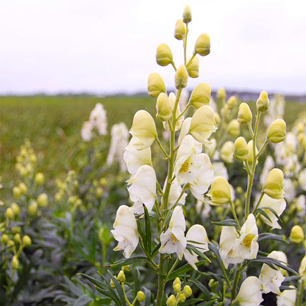 Саженцы Аконита (Борца) клобучкового Альбум (Album) привлекательны внушительными размерами, неприхотливостью и универсальностью. Травянистый многолетник одинаково хорошо растет на солнце и в тенистом цветнике. На прямостоячих прочных стеблях, высотой до метра, распускаются многочисленные белоснежные цветочки удивительной формы: верхние широкие лепестки соединены в подобие капюшона, нижние остаются раскрытыми. Размер каждого бутона не превышает 3 сантиметров. Цветение обильное, с июля по конец сентября. Размещая цветок в саду, необходимо помнить, что аконит ядовит. Растение зимостойко, но нуждается в плодородной почве.