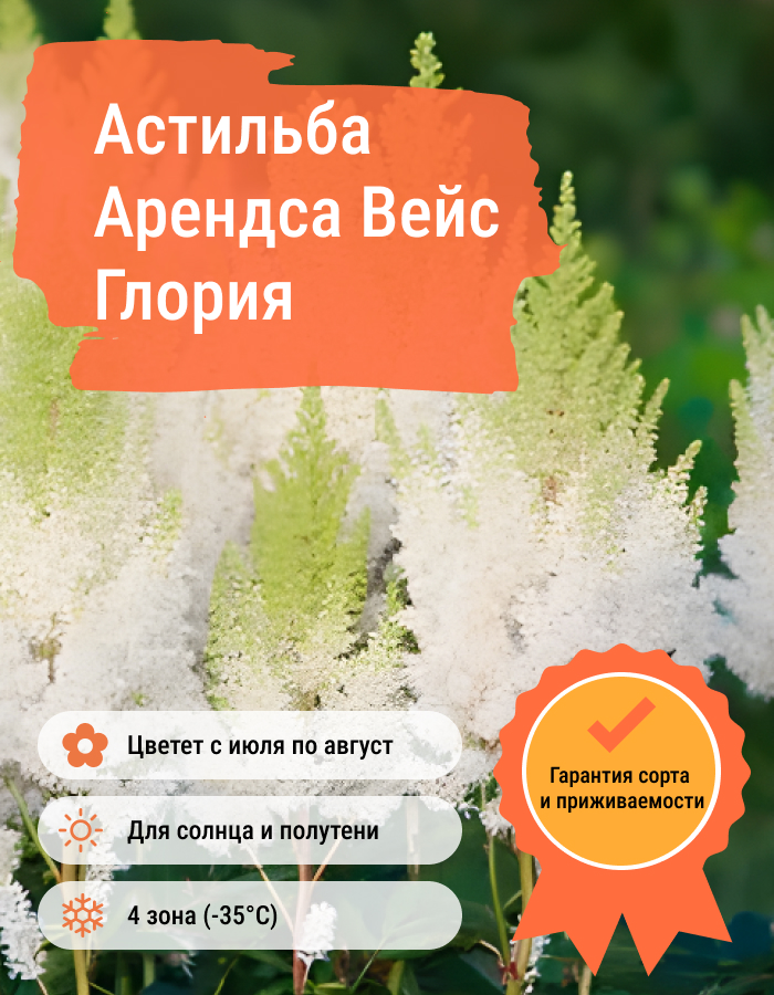 Рассада астильбы Арендса Вейс Глория (Weisse Gloria) – вырастет в необычайно эффектные растения с белыми ромбовидными соцветиями и душистым ароматом. Цветение начинается в начале июля и длится до 30 дней. Белоснежность цветов выгодно подчеркивает блестящая зеленая листва. Растение имеет форму кустов с высокими и мощными побегами. Великолепно смотрится на клумбе и возле деревьев, долго стоит в срезке. Сорт хорошо размножается семенами. Особенности посадки астильбы Арендса Вейс Глория: