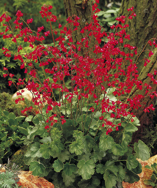 Рассада гейхеры Плю де Фё (Pluie de Feu) украсит небольшие водоемы и тенистые участки в вашем саду. Этот компактный и неприхотливый в выращивании сорт отличается броскими коралловыми цветками и зелёными листьями с мраморными разводами. Цветут они в июне и июле. Подкармливать семена гейхеры Pluie de Feu нужно лишь изредка, и этого «корма» требуется вдвое меньше, чем для других садовых растений. Декоративную ценность имеют не только алые цветы, но и сами листья. Вырастают эти цветы до 35 см. Прекрасно гармонируют с ирисами и седумами. Отличное естественное затемнение могут создать близ растущие яблони или кустарники.