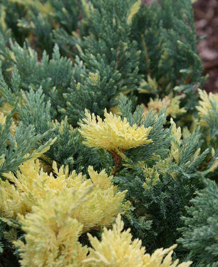 Кустарник усыпан маленькими хвойными иголочками. Цвет не однородный, кончики побегов окрашены в бело-желтый оттенок, а основная часть ветки – зелёная. Можжевельник растёт на любой почве, отдаёт предпочтение солнечным местам, но хорошо растёт и в тенистой местности. Ландшафтные дизайнеры используют этот кустарник в композициях, часто высаживают в контейнеры.