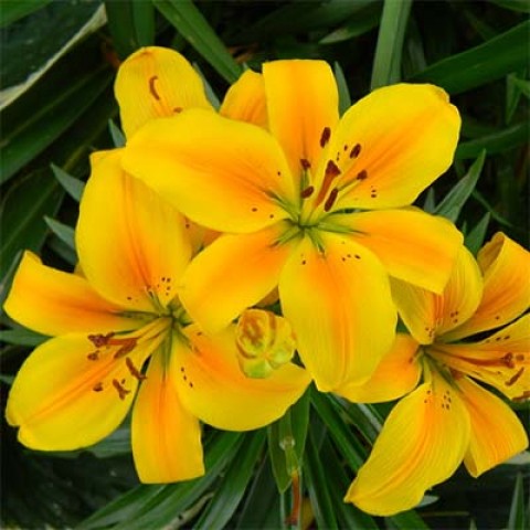 Лилия азиатская Golden Joy (Голден Джой) относится к низкорослым горшечным сортам, она прекрасно будет себя чувствовать и в комнате, и на балконе летом. Высота взрослого растения 35-40 см. Цветок насыщенно-желтый с оранжевым центром и мелким крапом у основания, крупный, до 16 см в диаметре. Цветение наступает в июне-июле. Сорт неприхотлив, легко поддается размножению,очень морозостоек. Предпочитает солнечные участки, защищенные от сильных ветров, нейтральные или слабокислые и хорошо удобренные почвы. Плохо растет на известковых почвах. Необходим умеренный полив. Место посадки не должно затопляться талыми или ливневыми водами.