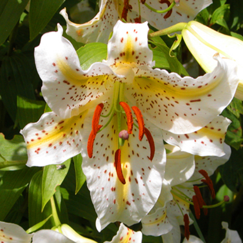 • Окраска цветка : крупный, белый, вдоль лепестков широкая ярко-желтая полоса, ярко-оранжевые пыльники и крап по большей поверхности лепестков