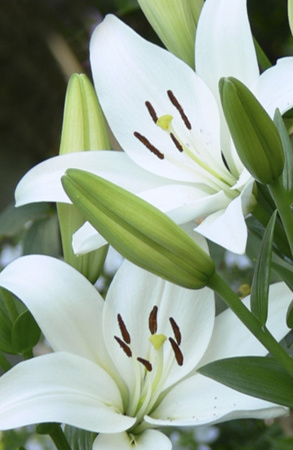 • Окраска цветка : крупный, белый удлиненной формы, темно-оранжевые пыльники, у центра мелкий редкий красный крап